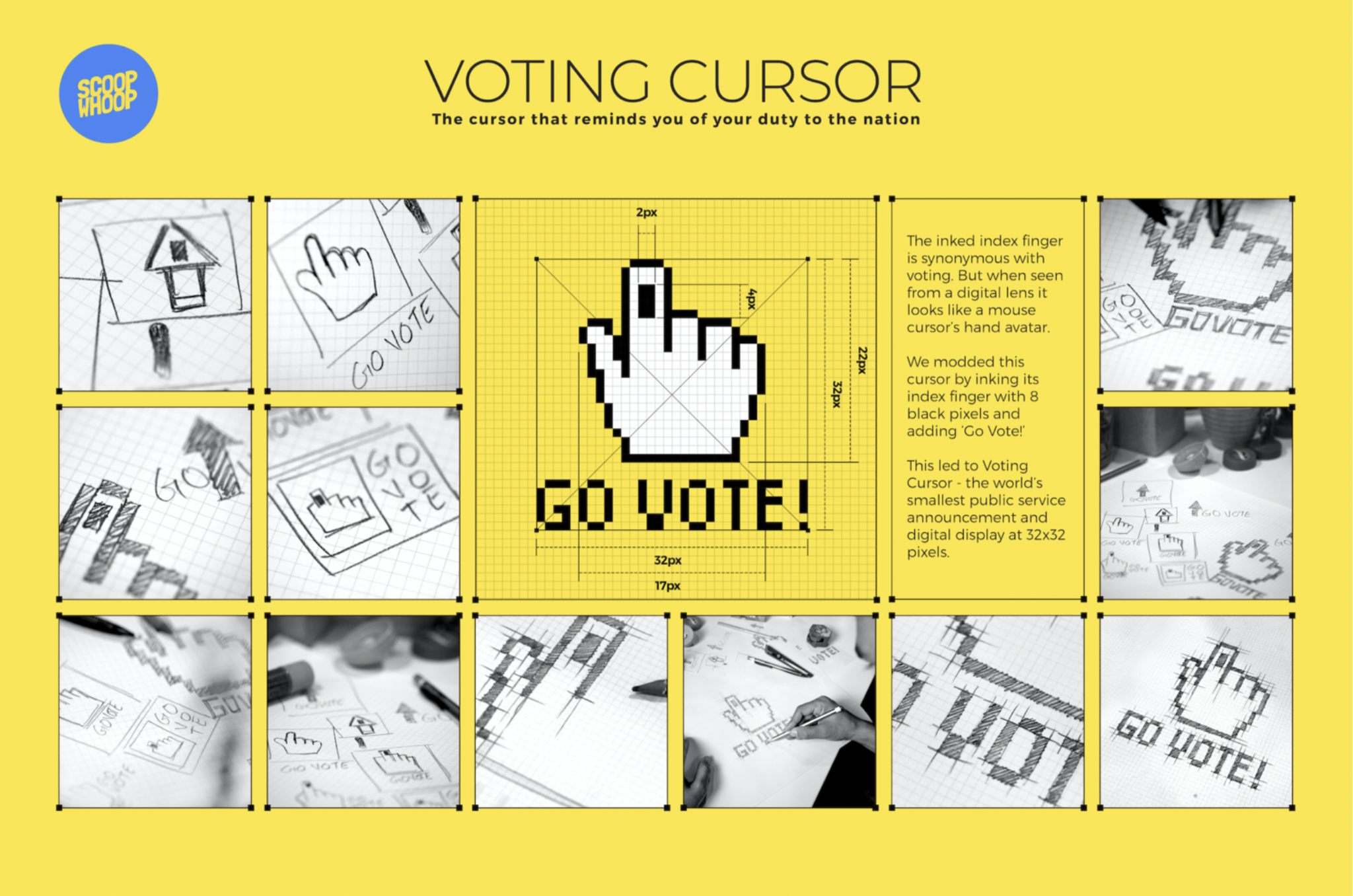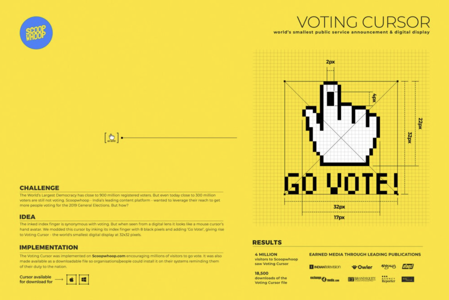 The inked index finger is synonymous with voting. But when seen from a digital lens it looked like a mouse cursor’s hand avatar. We modded this cursor by inking its index finger with 8 black pixels and adding ‘Go Vote’! Giving rise to the Voting Cursor - the world’s smallest digital display and public service announcement at 32x32 pixels.